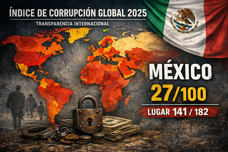 Transparencia Internacional publicó este martes 10 de febrero su Índice de Percepción de la Corrupción Global 2025, un referente mundial para medir cómo se percibe la corrupción en el sector público. En este reporte, México registró una ligera mejora al pasar de 26 a 27 puntos, pero se mantuvo entre los países peor evaluados del mundo al ubicarse en el lugar 141 de 182 naciones analizadas.